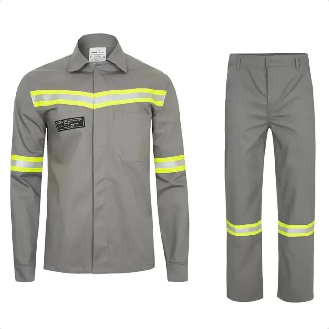 Conjunto composto por camisa e calça com tecido especial para proteção contra riscos elétricos.